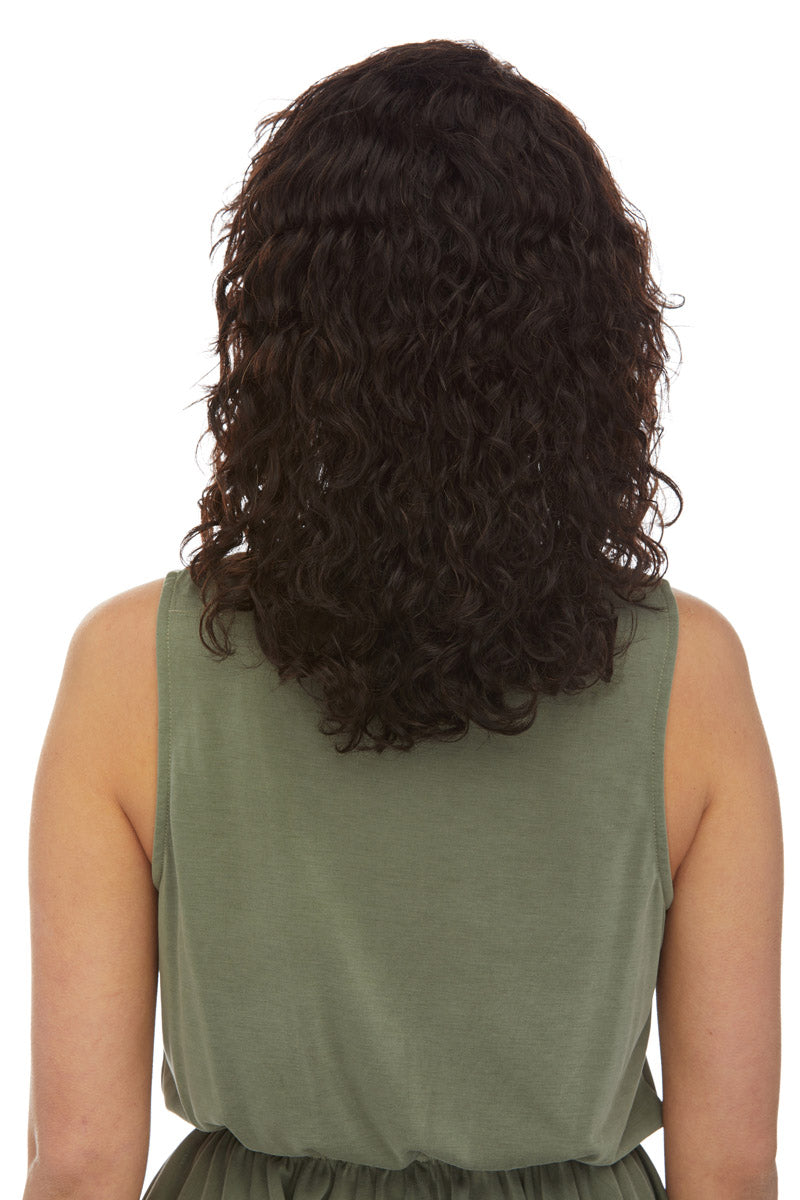 A shoulder length, full and naturally curly-do made of soft Brazilian remy human hair.