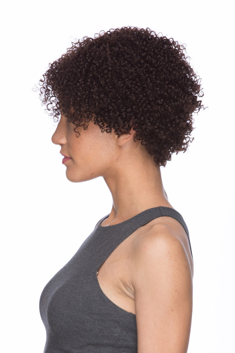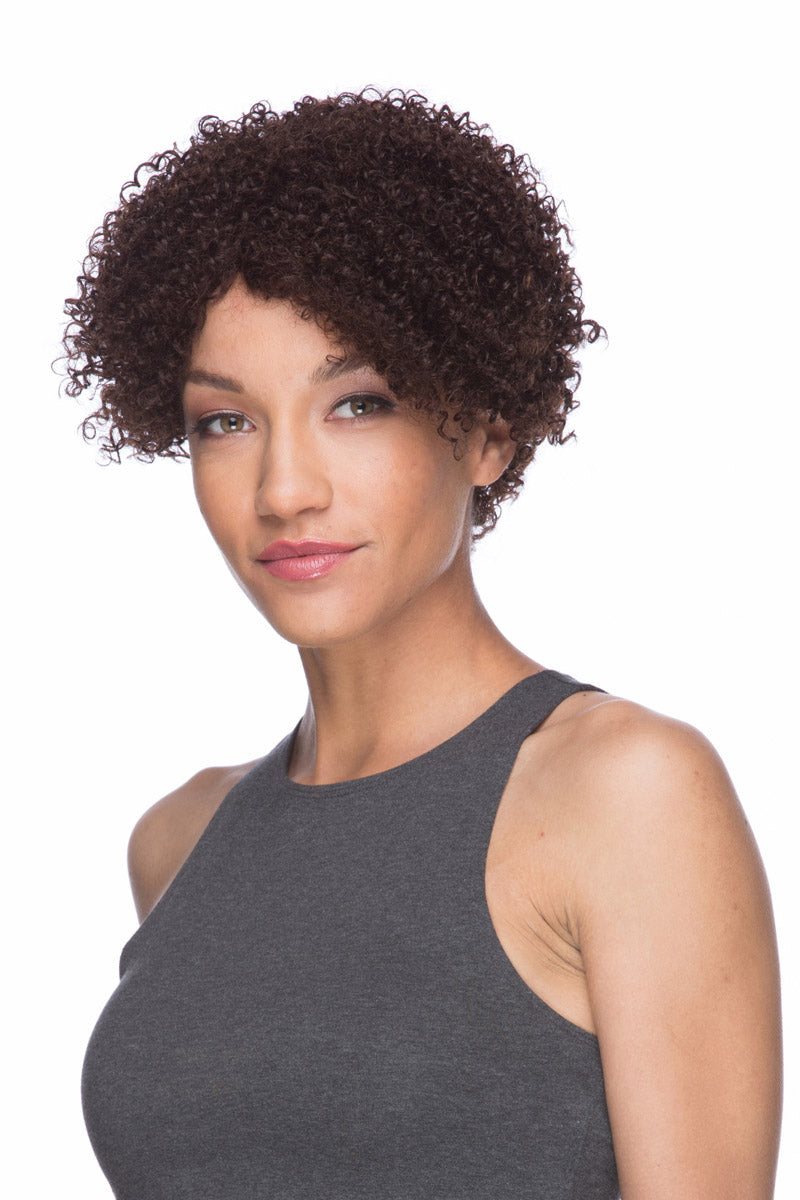 A cute spunky short asymmetrical haircut with tight bouncy spiral curls.