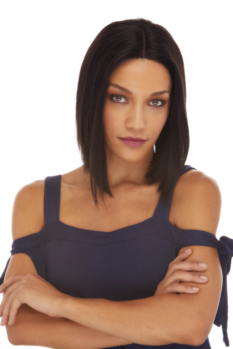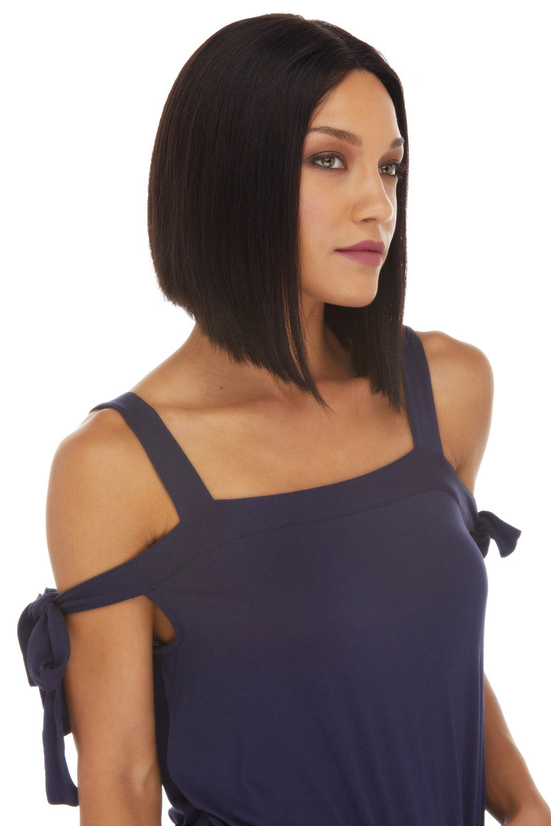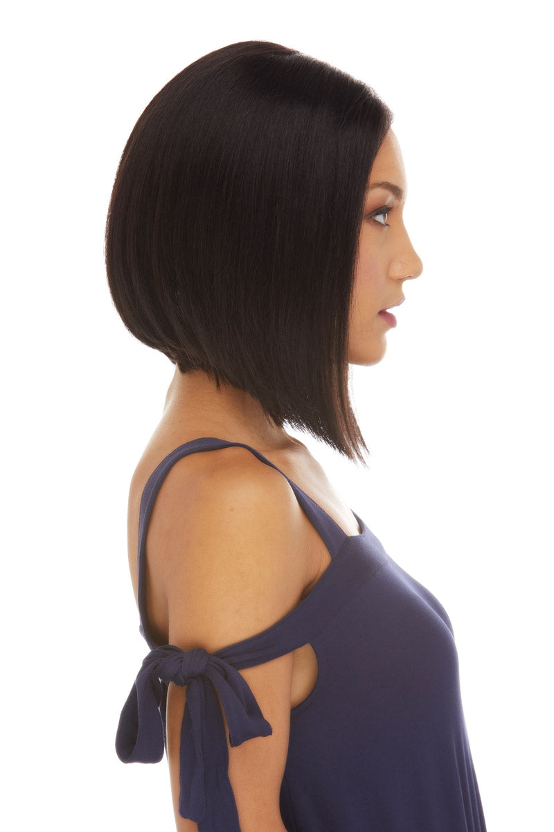 This ultra sleek short style has a deep center part. The front length is cut longer than the back.