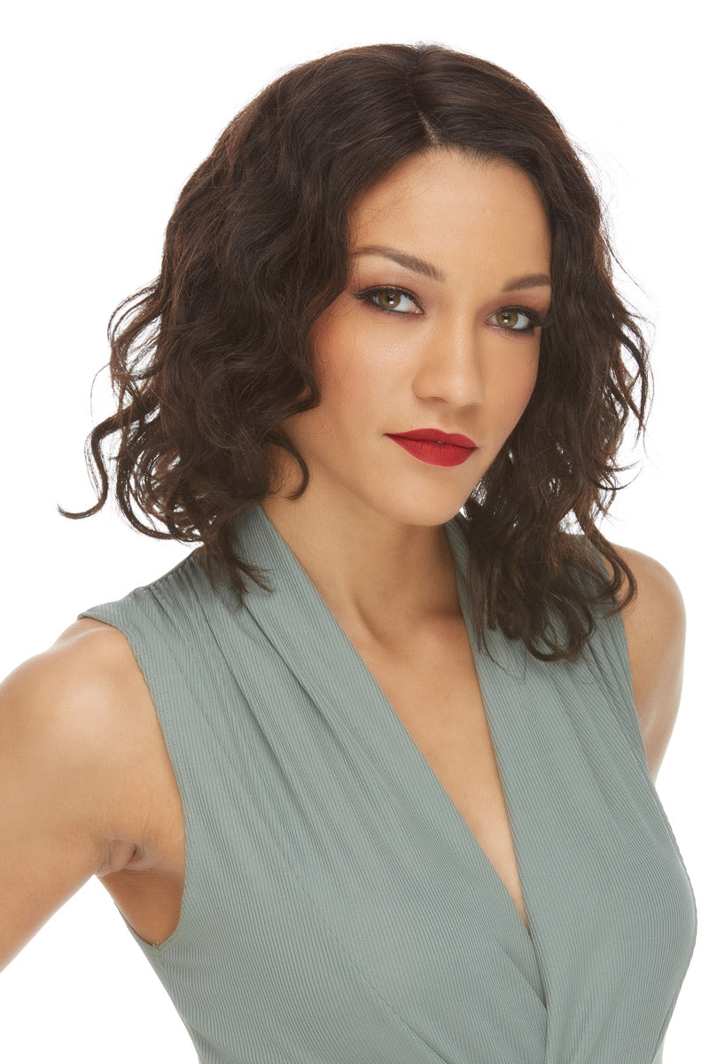 A short wavy bob with a tousled look. This wig is completed with a natural side part that allows the hair to hang naturally.